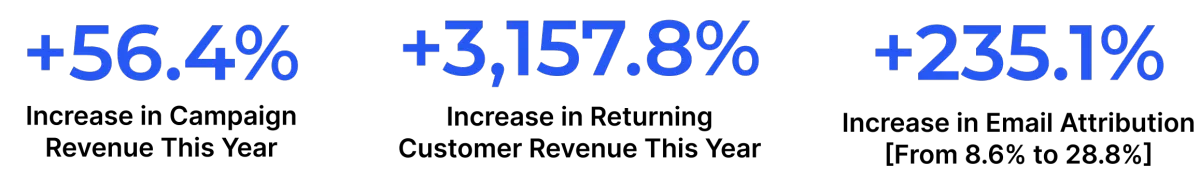 Delivered impact - returning customer revenue grew +3,157%, retention share of total revenue rose +235%, and email reach expanded +183%.